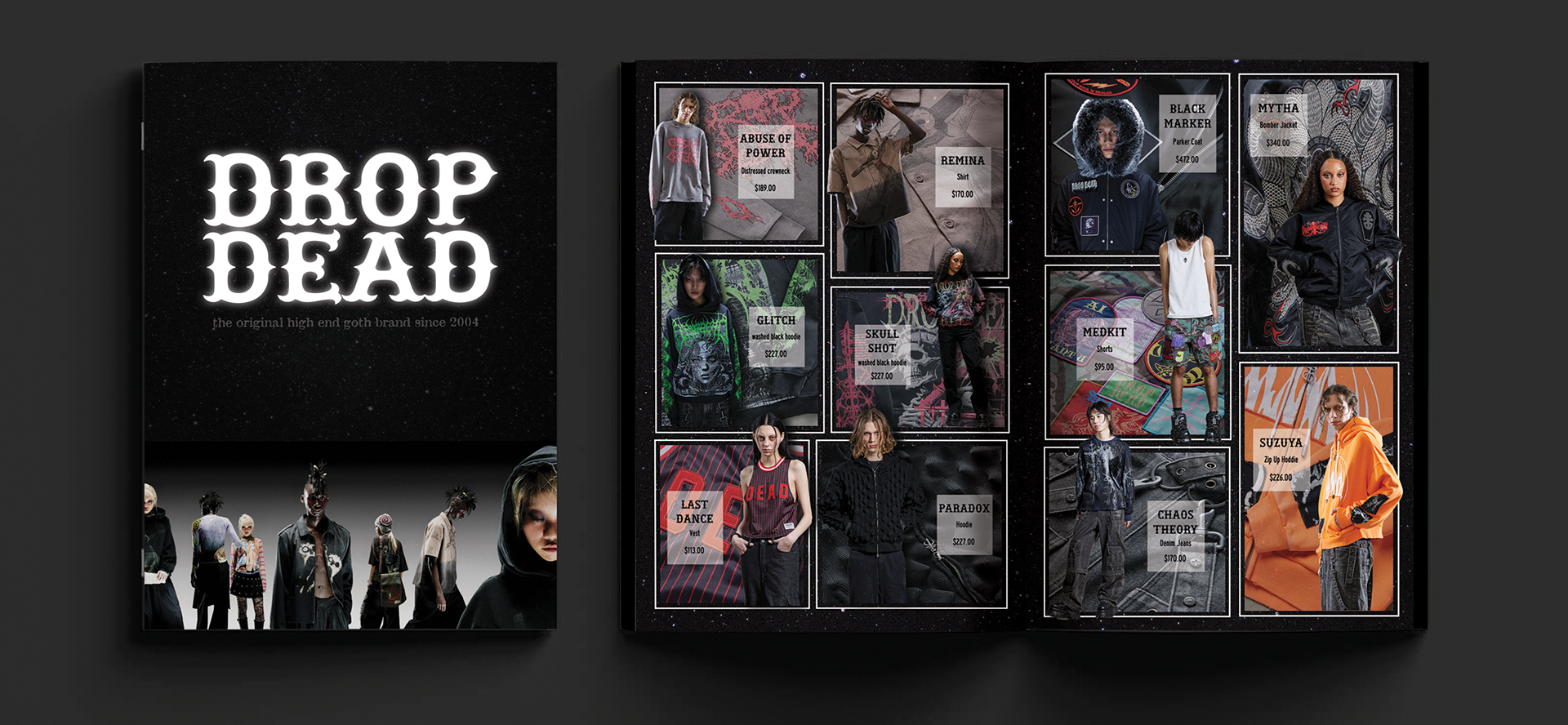 The Drop Dead brochure was created in response to a prompt to design promotional material for Drop Dead Clothing. To ensure the final piece aligned with the brand, its visual style, tone, and overall aesthetic were carefully studied, with a focus on the gritty, bold, and expressive qualities that define its identity.